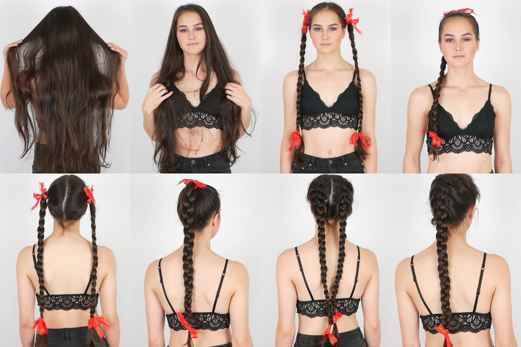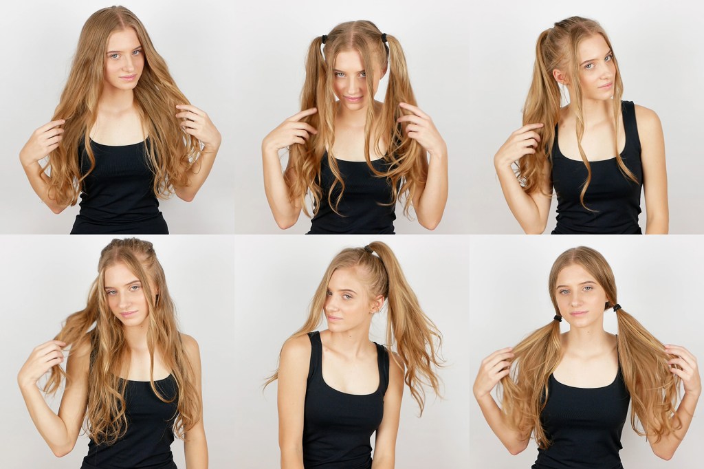 Here, we show simple long hair styles being made and presented; various variations of simple ponytails, pigtails, braids, and buns.
